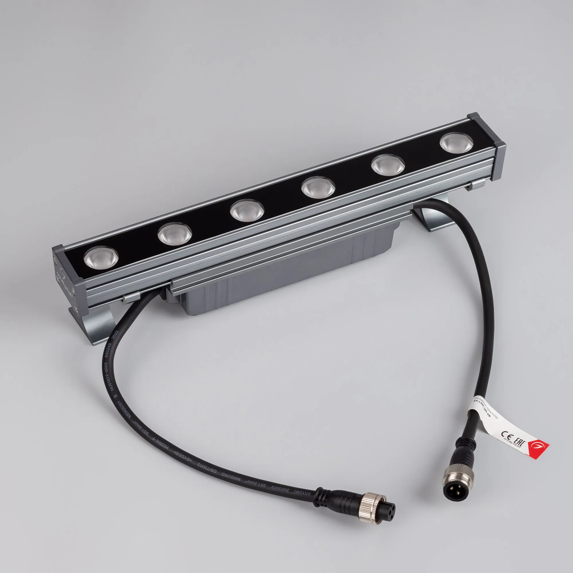 Линейный прожектор. Мощность 6 Вт, св. поток 480 лм, 80 лм/Вт, тёплый 3000 K, CRI>80, угол 30°, напряжение питания 230 В. Серый прямоугольный корпус из алюминия, экран стекло, степень защиты IP65. Размер: длина 300 мм, ширина 40 мм, высота 30 мм. Монтаж на кронштейнах.