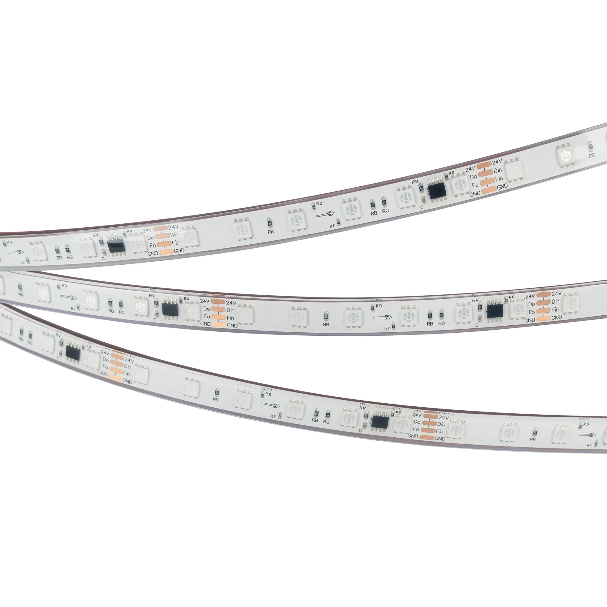 Светодиодная герметичная лента SPI серии B60 с микросхемой MT1808A, IP68 (PFS- полная силиконовая экструзия). Светодиоды SMD 5060, 60 шт/м, 10 pixels на 1 м (50 pixels на 5 м), 1 pixel = 6 светодиодов, белая плата шириной 10 мм, скотч 3М. Цвет RGB, угол 120°. Питание 24 В, мощность 12 Вт/м (60 Вт на 5 м). Размеры 5000x12x5 мм. Мин. отрезок 100 мм, 6 светодиодов. Цена за 1 м.