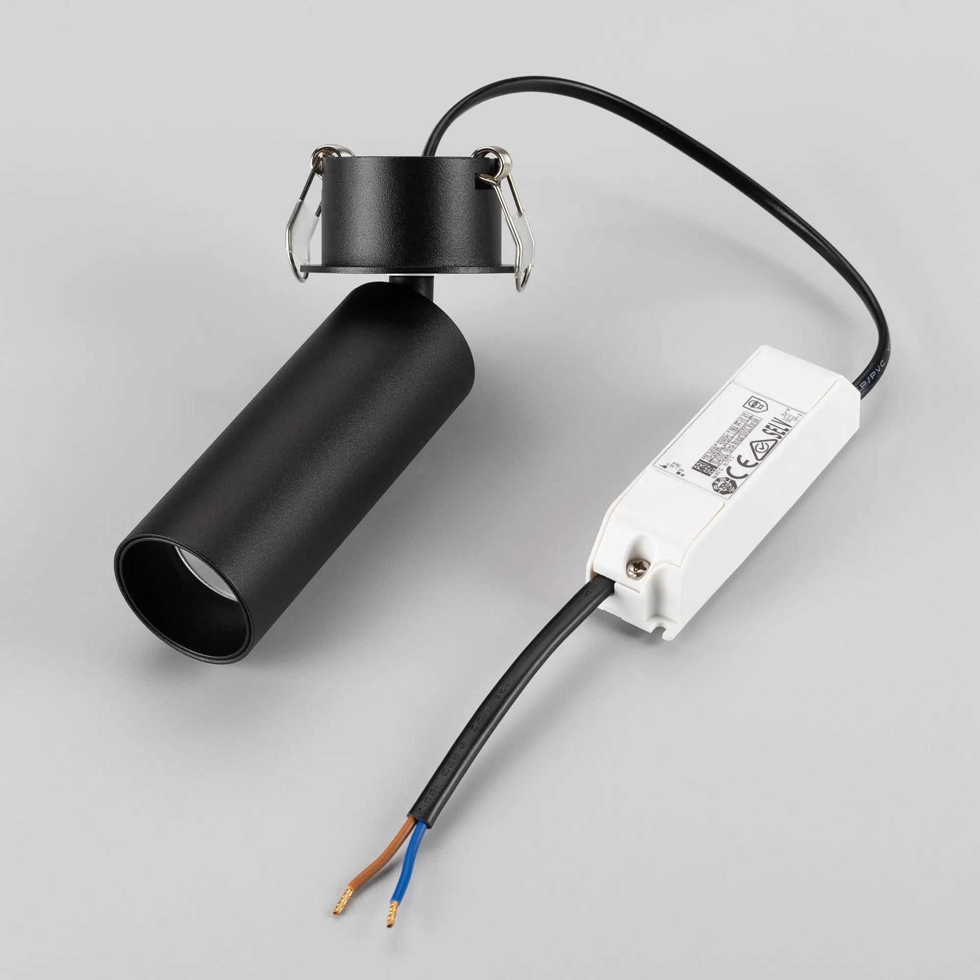 Светильник встраиваемый откидной. Мощность 7 Вт, св. поток 490 лм, 70 лм/Вт, теплый 3000 K, CRI>90, угол 36°, напряжение питания 230 В. Черный круглый корпус из алюминия, экран PMMA, степень защиты IP40. Размер: диаметр 35 мм, высота светового модуля 90 мм, высота основания 1.5 мм. Угол поворота 350°, угол наклона 90°. Монтаж встраиваемый, установочное отверстие: диаметр 45 мм, глубина 29 мм. Драйвер в комплекте 30-40 В, 150 мA, пульсация <1%.