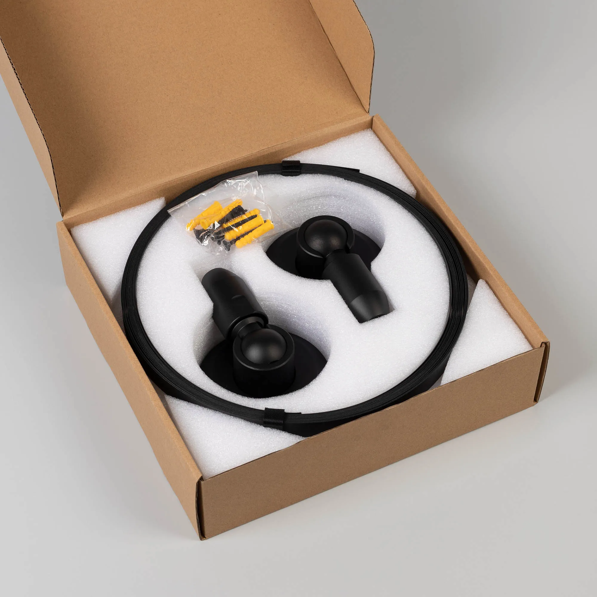 Система креплений Stingray-R2 для светодиодной ленты. Цвет - черный. Фиксирует светодиодную ленту в свободном пространстве между двумя стенами. Максимальная длина 10 м. В комплект входит: гибкая стальная полоса для ленты длиной 10 м и шириной 15 мм, 2 настенных крепления. Лента и источник питания комплектуются по запросу.