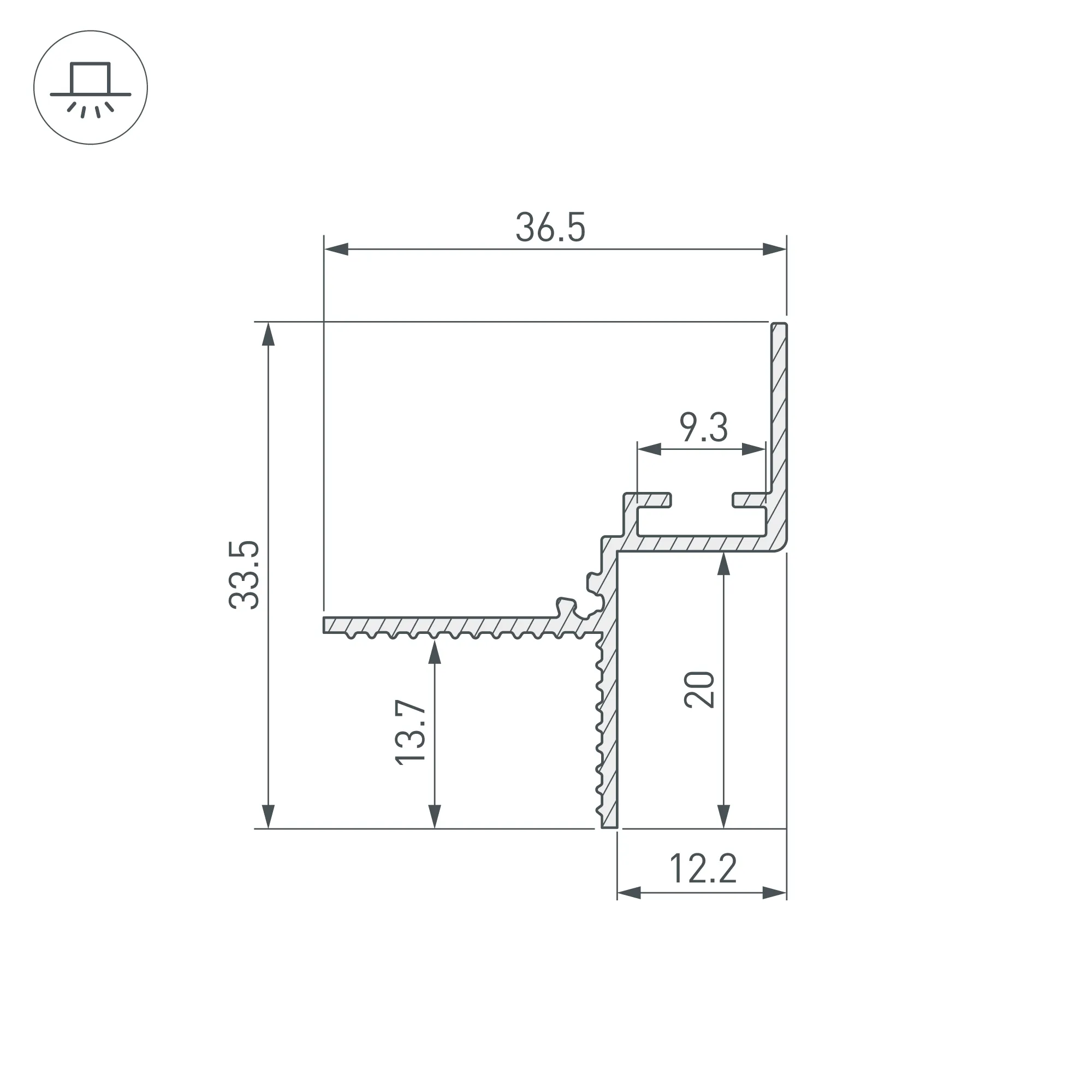 Алюминиевый анодированный встраиваемый профиль. Цвет - черный. Теневой несветовой профиль для создания зазора 12,2 мм между поверхностью потолка и стены. Создает эффект парящего потолка с четким контуром и небольшой тенью по периметру помещения. Такое решение визуально расширяет пространство и идеально подходит для современного минималистичного интерьера. Габаритные размеры (L×W×H): 3000х36,5х33,5 мм. Аксессуары приобретаются отдельно. Цена за 1 метр.