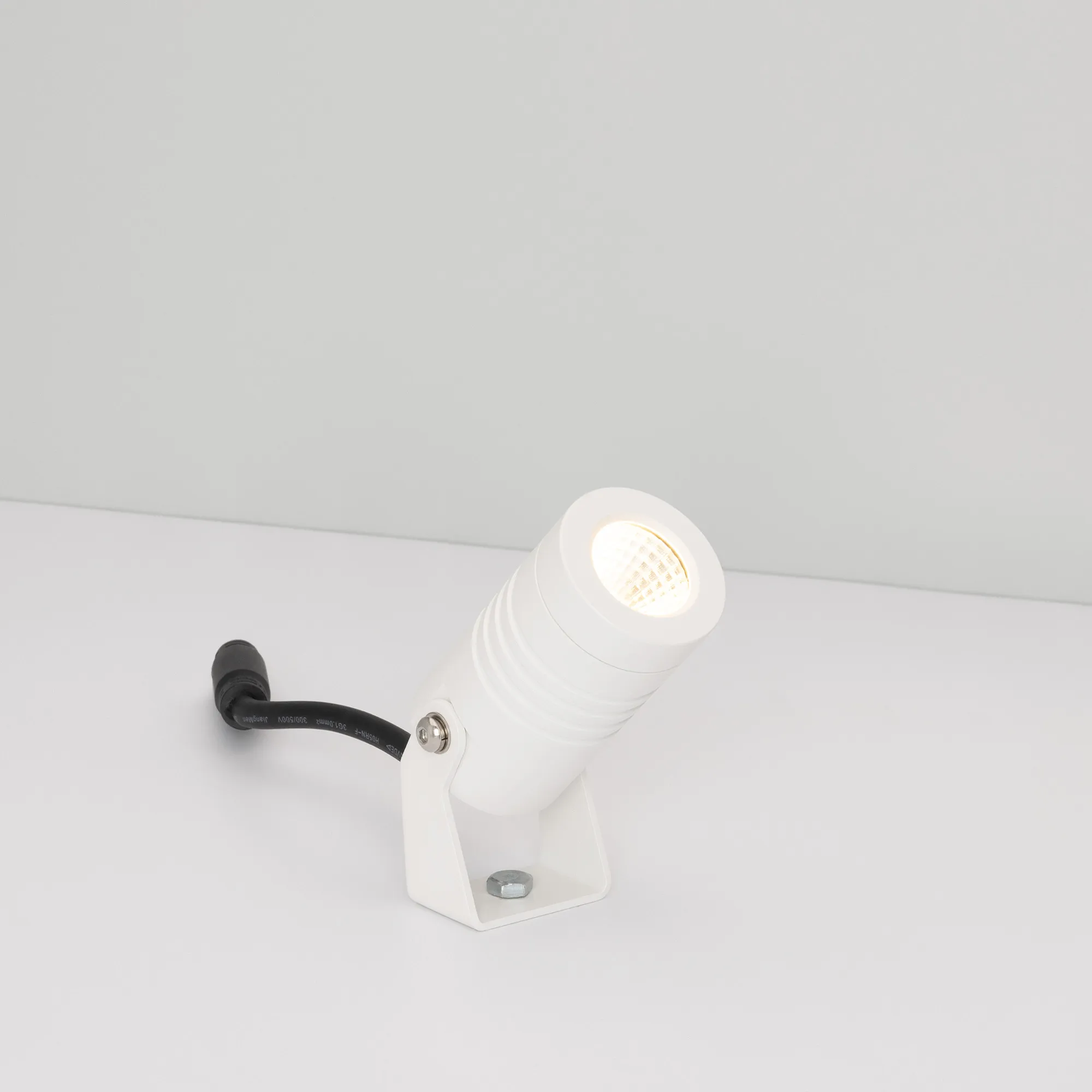 Уличный светодиодный прожектор, мощность 5Вт, угол освещения 25°. Цвет ТЕПЛЫЙ 3000К, световой поток 310лм. Влагозащищенный корпус IP67 - белый алюминий, экран из закалённого стекла. Угол поворота корпуса в вертикальной плоскости 135°. Питание 230В, мощность 5 Вт. Размеры DxH -Ø42х77мм. В комплекте 1м провод.