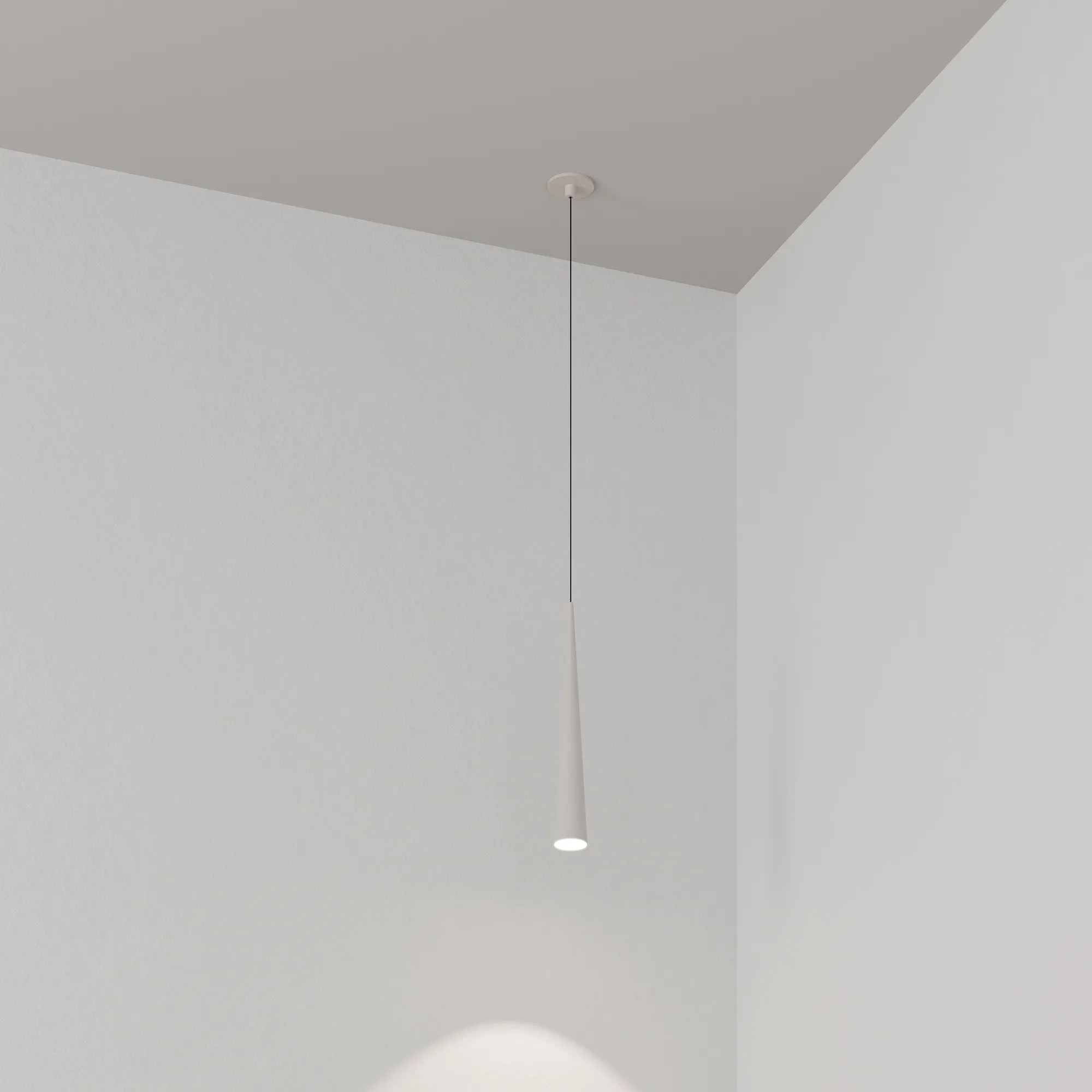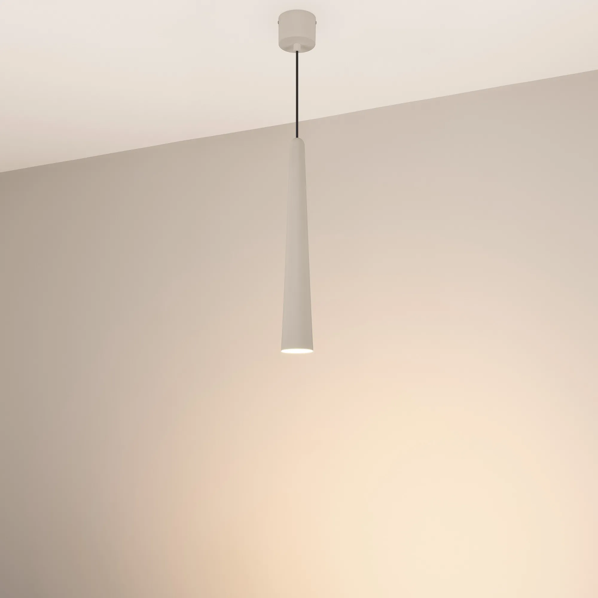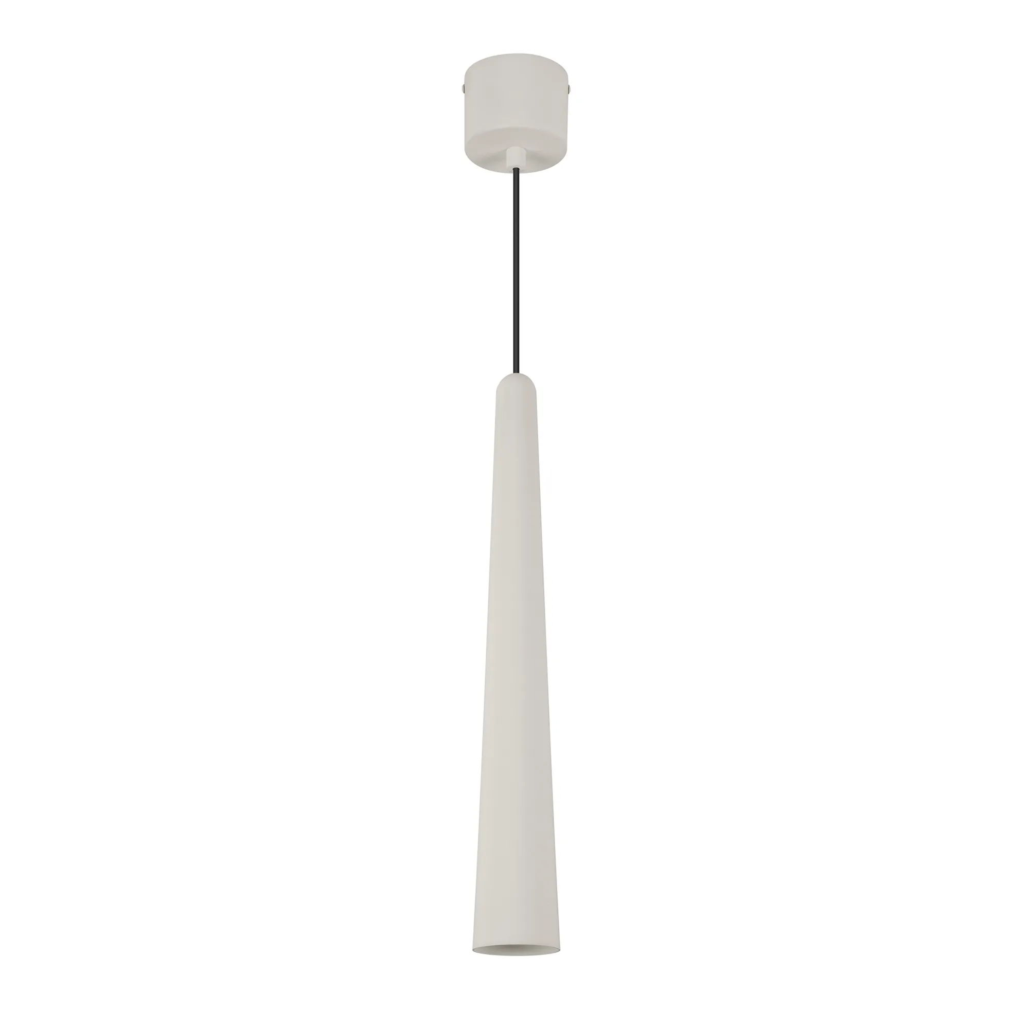 Подвесной светильник. Мощность 5 Вт, св. поток 400 лм, световая эффективность 70 лм/Вт, теплый 3000K, CRI>92, угол 36°, напряжение питания 230 В. Светло - серый конусообразный вытянутый корпус из алюминия, линза из PMMA, степень защиты IP20. Размер: диаметр 57 мм, высота 400 мм. Монтаж подвесной, длина подвеса 2000 мм, регулируемая. В комплекте 2 вида чаш. Габариты встраиваемой чаши: Ø 80x41 мм. Габариты накладной чаши Ø80x60 мм. Драйвер 2,8-12В, 500 мА, пульсация <1%.