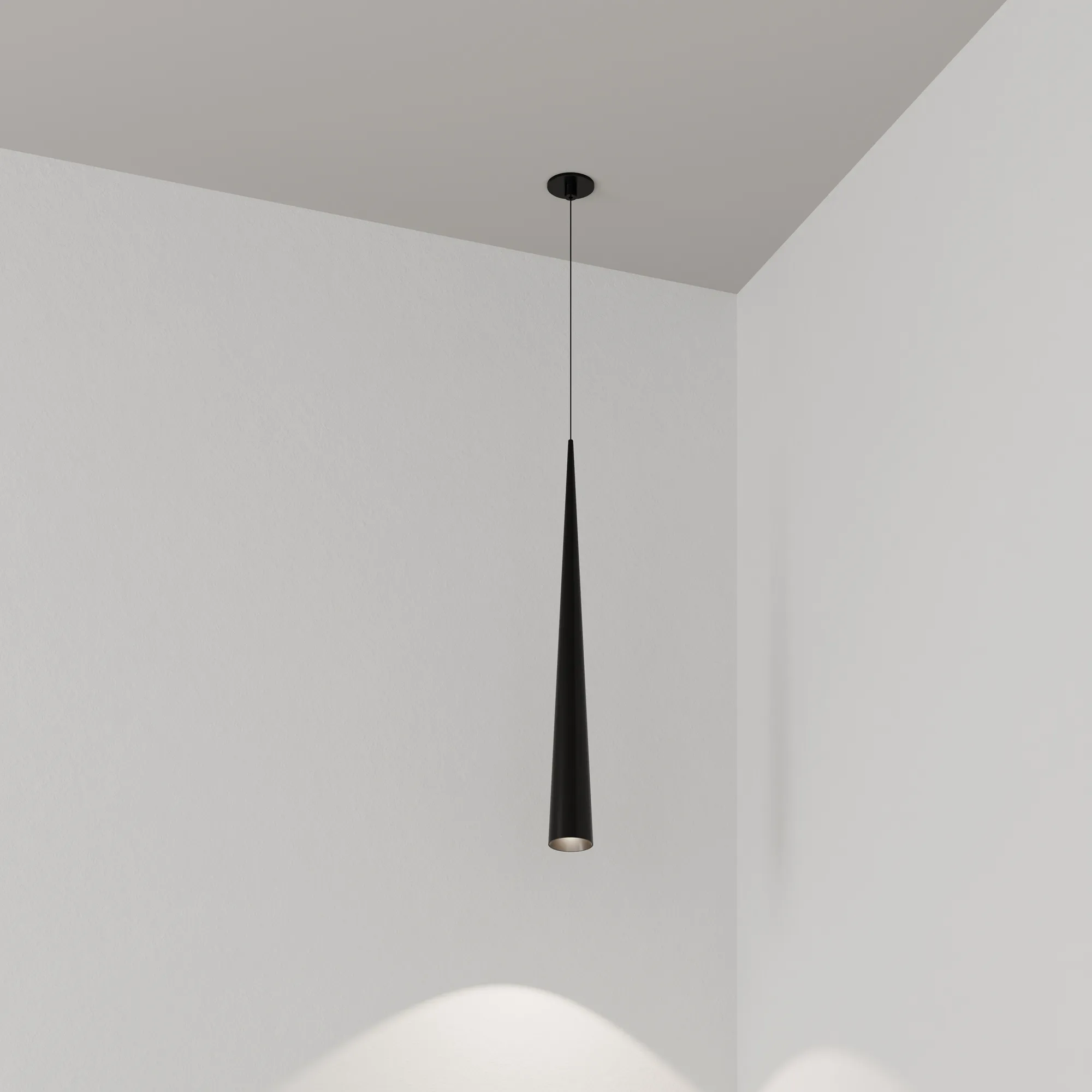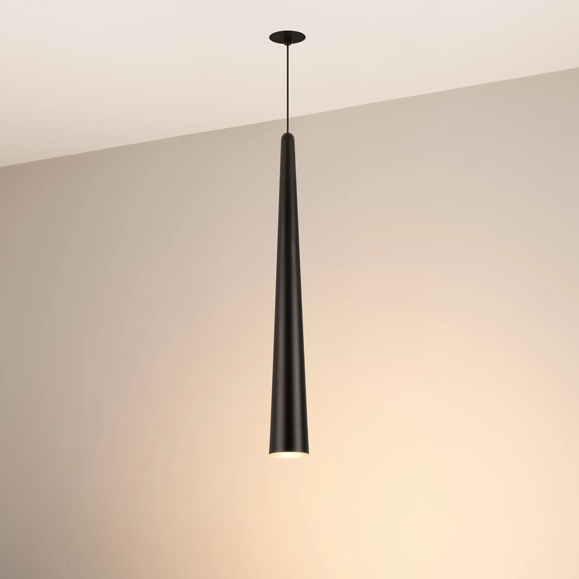 Подвесной светильник. Мощность 5 Вт, св. поток 400 лм, 70 лм/Вт, теплый 2700 K, CRI>92, угол 36°, напряжение питания 230 В. Чёрный конусообразный вытянутый корпус из алюминия, линза из PMMA, степень защиты IP20. Размер: диаметр 76 мм, высота 670 мм. Монтаж подвесной, длина подвеса 2000 мм, регулируемая. В комплекте 2 вида чаш. Габариты встраиваемой чаши: Ø 80x41 мм. Габариты накладной чаши Ø80x60 мм. Драйвер 2,8-12В, 500 мА, пульсация <1%.