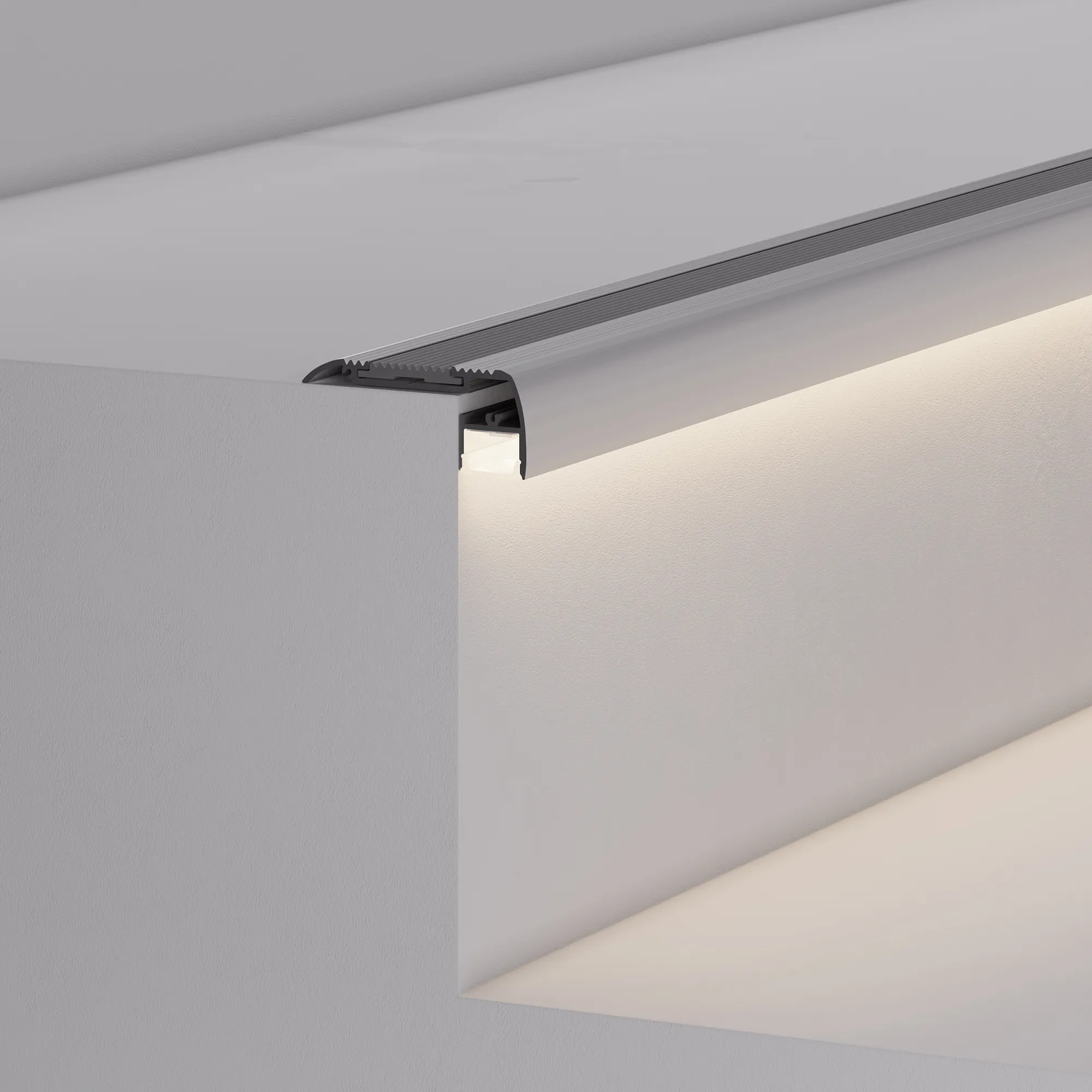 Алюминиевый анодированный накладной профиль для ступеней. Антискользящая вставка идет в комплекте с профилем. Габаритные размеры (L×W×H): 2000x64x27 мм (накладная часть на ступеньку 45 мм). Ширина площадки для ленты 15,5 мм. Экраны и заглушки приобретаются отдельно. Цена за 1 м.