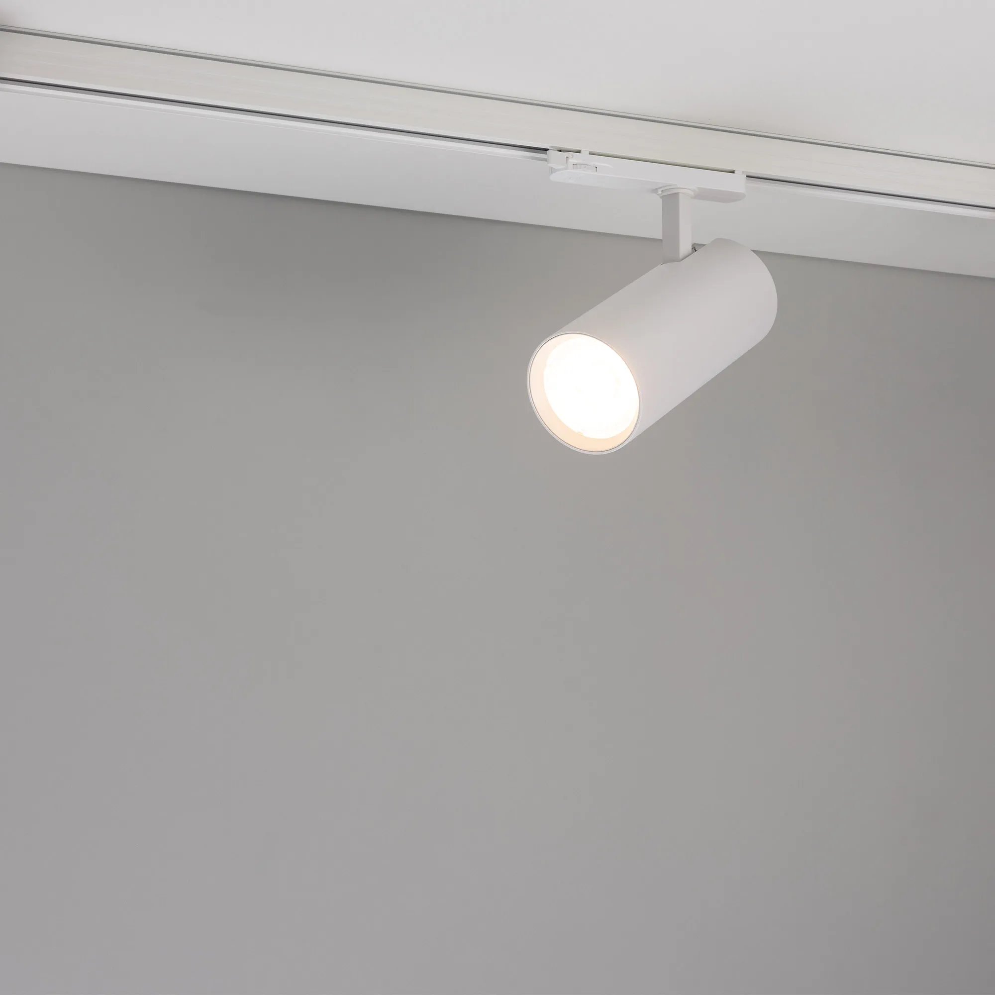 Светильник для треков/шин 4 провода. Мощность 40Вт, св. поток без решетки honeycomb 4000 лм, 100 лм/Вт, с решеткой honeycomb 2640 лм, 66 лм/Вт, дневной 4000 K, CRI>90, угол 24°, напряжение питания 230 В. Белый круглый корпус из алюминия, материал линзы PMMA, степень защиты IP20. Размер: диаметр 90 мм, длина световой части 141 мм. Монтаж на трек 3-фазный. Драйвер встроенный 24-42 В, 750мА., пульсация <5%