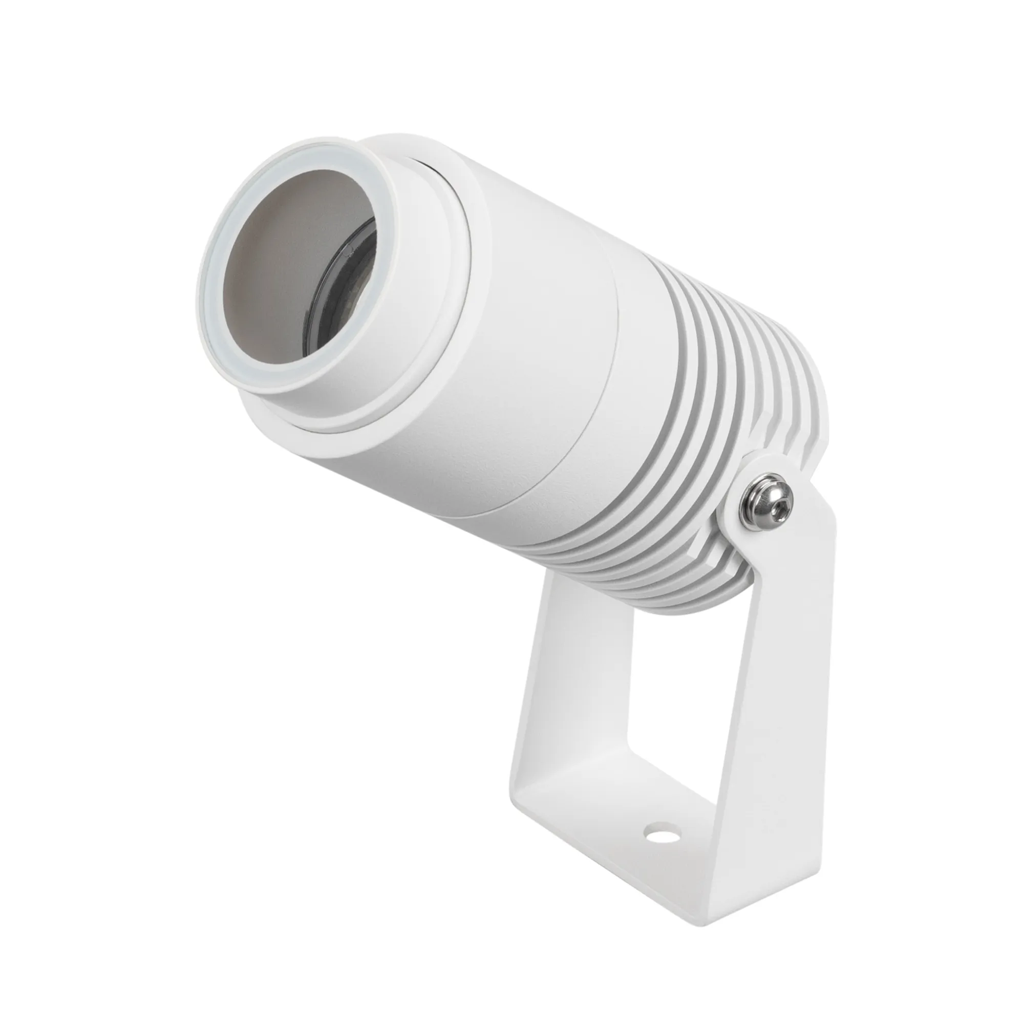 Уличный светодиодный прожектор, мощность 8Вт, регулируемый угол освещения 10-40°. Цвет ТЕПЛЫЙ 3000К, световой поток для угла 10° 240 для угла 40° 420лм. Влагозащищенный корпус IP67 - белый алюминий, экран из закаленного стекла. Угол поворота корпуса в вертикальной плоскости 135°. Питание 230В, мощность 8 Вт. Размеры DxH - Ø52x103мм. В комплекте 1м провод.