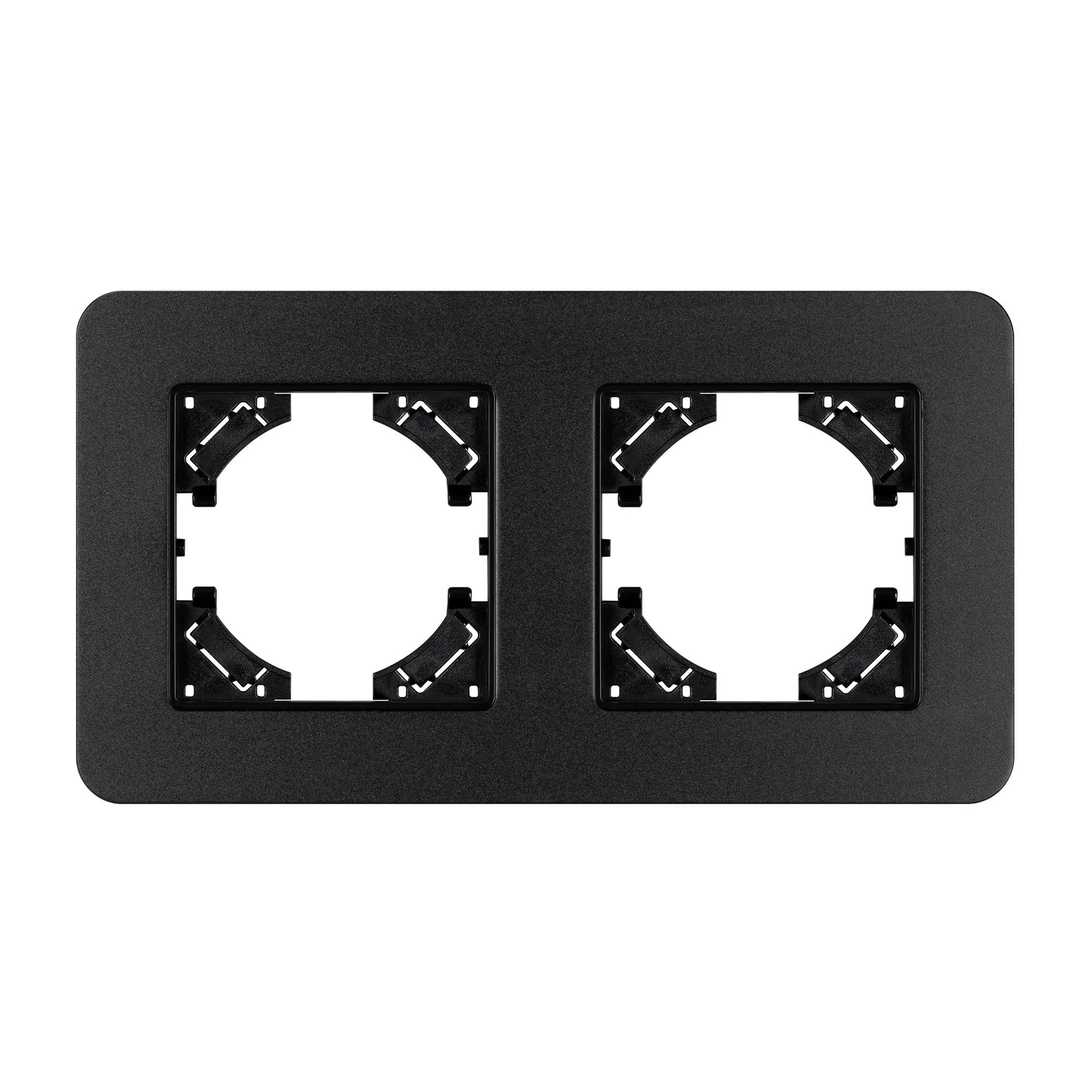Рамка алюминиевая на 2 поста, под встраиваемый механизм. Цвет - черный с Soft-Touch покрытием. Уровень герметичности IP20. Ориентация монтажа - горизонтальная (основным ориентиром служат посадочные выступы для накладки механизма).