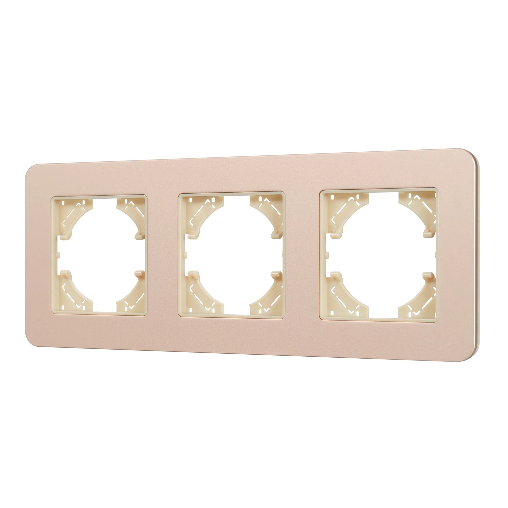 Рамка алюминиевая на 3 поста, под встраиваемый механизм. Цвет - золотой с Soft-Touch покрытием. Уровень герметичности IP20. Ориентация монтажа - горизонтальная (основным ориентиром служат посадочные выступы для накладки механизма).