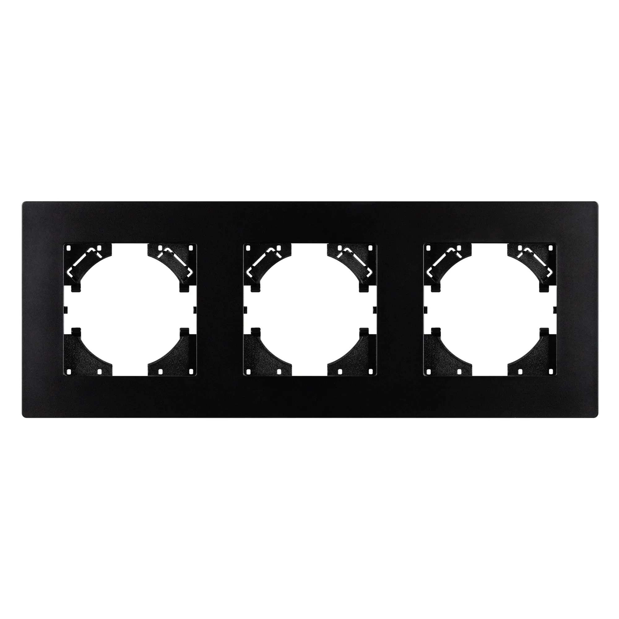 Рамка пластиковая на 3 поста, под встраиваемый механизм. Цвет - черный. Уровень герметичности IP20. Ориентация монтажа - горизонтальная (основным ориентиром служат посадочные выступы для накладки механизма).