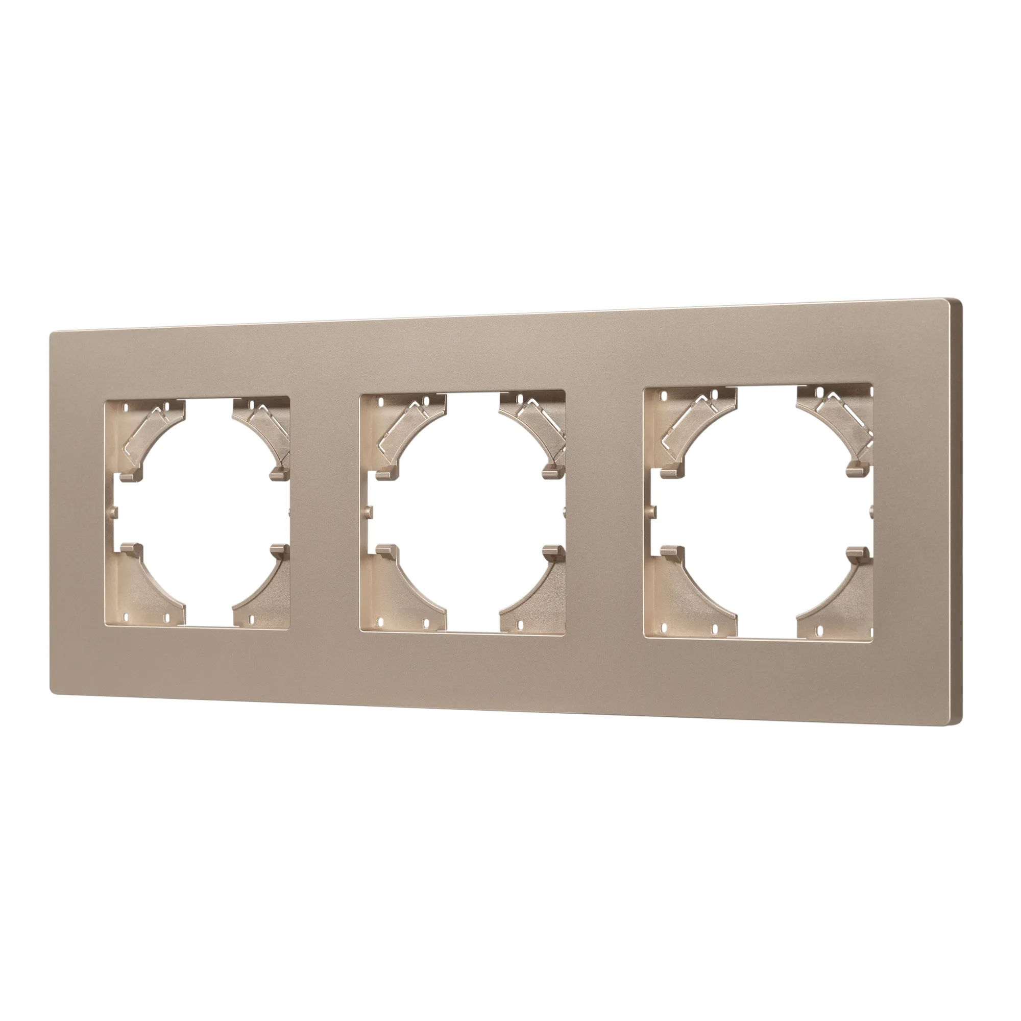 Рамка пластиковая на 3 поста, под встраиваемый механизм. Цвет - золотой. Уровень герметичности IP20. Ориентация монтажа - горизонтальная (основным ориентиром служат посадочные выступы для накладки механизма).