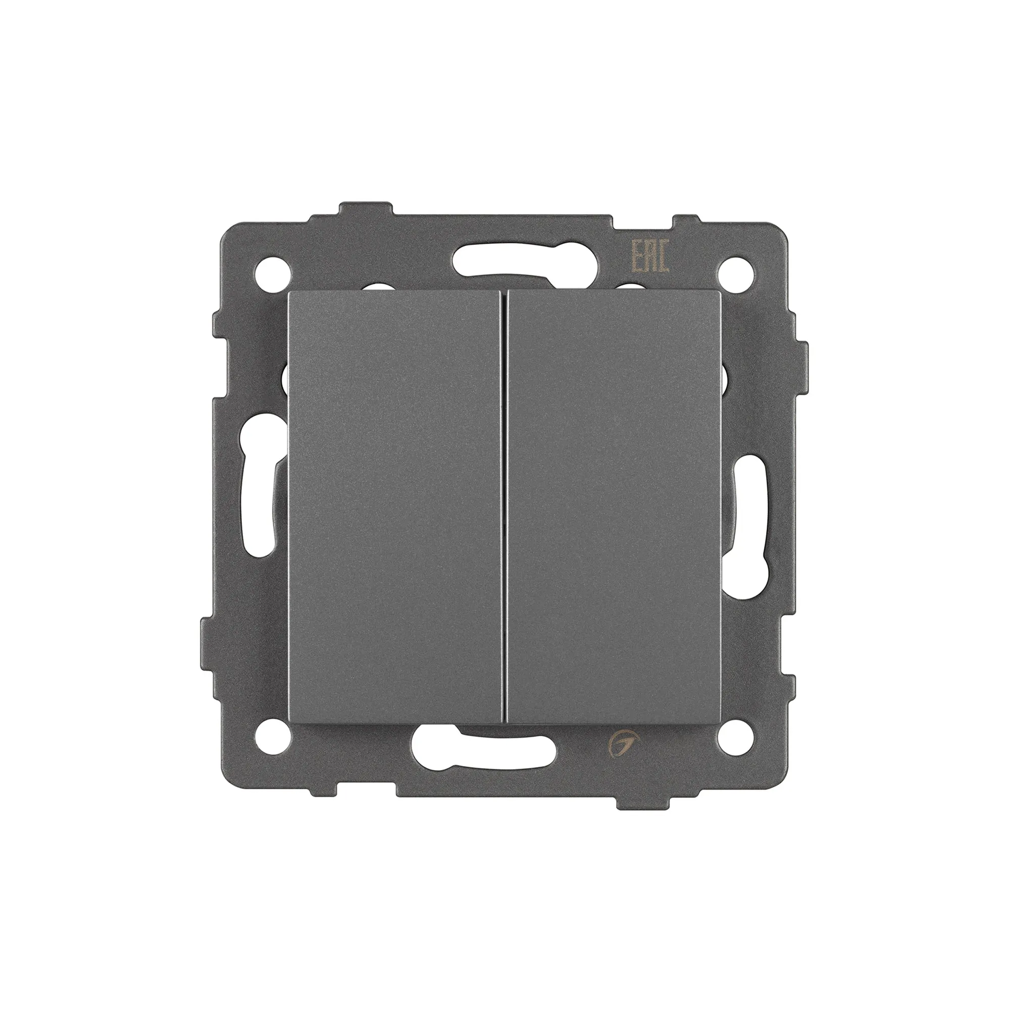 Механизм выключателя света клавишный на 1 пост 2 клавиши (непроходной). Цвет - серый. Без фронтальной рамки. Уровень пылевлагозащиты IP20. Выключатель устанавливается в стандартный круглый подрозетник.