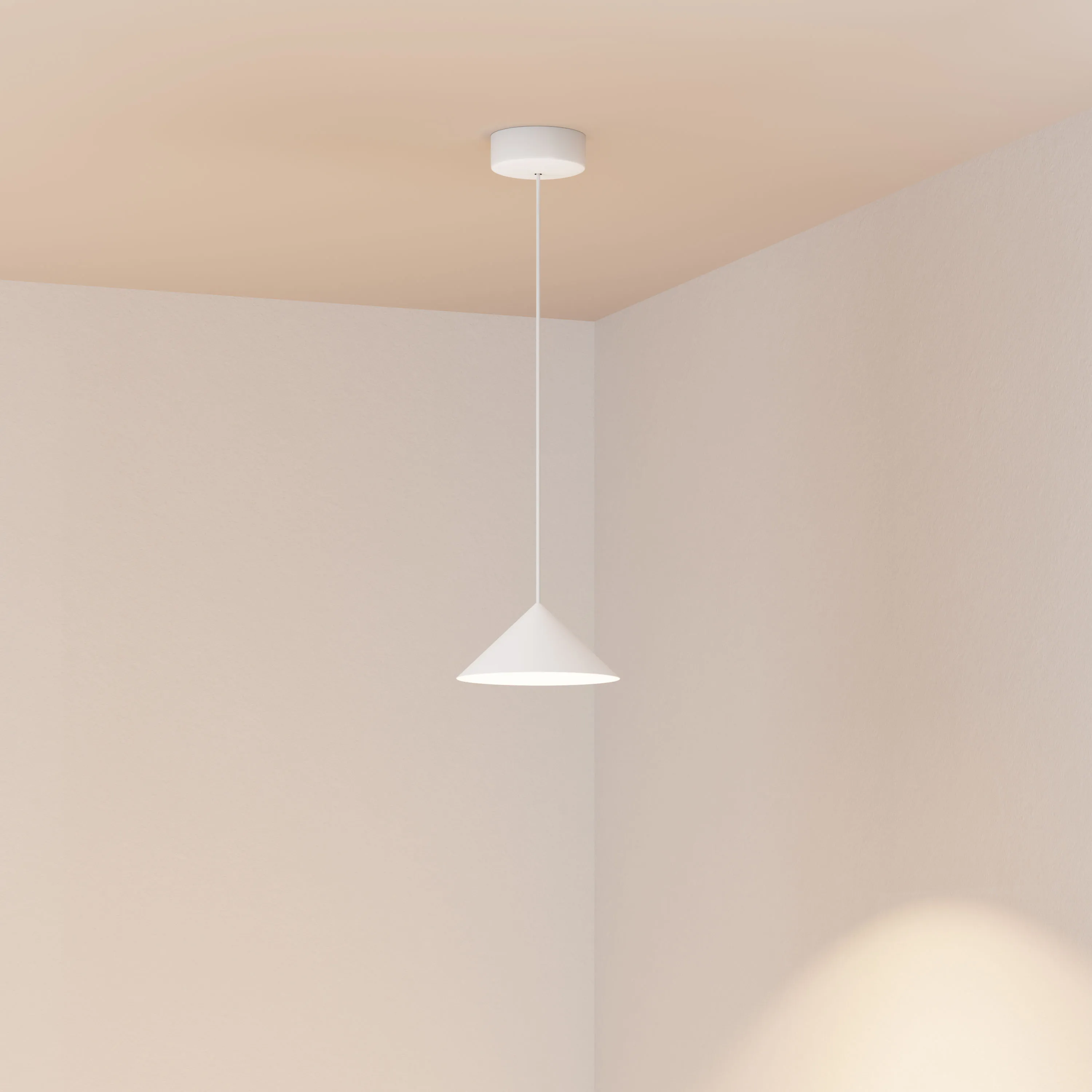 Подвесной светильник. Мощность 10 Вт, св. поток 750 лм, 75 лм/Вт, теплый 3000K, CRI>94, угол 36°, напряжение питания 230 В. Белый корпус из алюминия в форме конуса с белой внутренней поверхностью, линза-рассеиватель из PMMA, степень защиты IP20. Размер: диаметр 240 мм, высота 110 мм. Монтаж подвесной, длина подвеса 2000 мм, регулируемая. В комплекте две чаши. Габариты чаши (встроенной) Ø80 х 41 мм, врезное отверстие Ø55 мм, габариты чаши (накладной) Ø110 х 25 мм.. Драйвер 2,8-12В, 520 мА, пульсация <1%. Управление по TRIAC.
