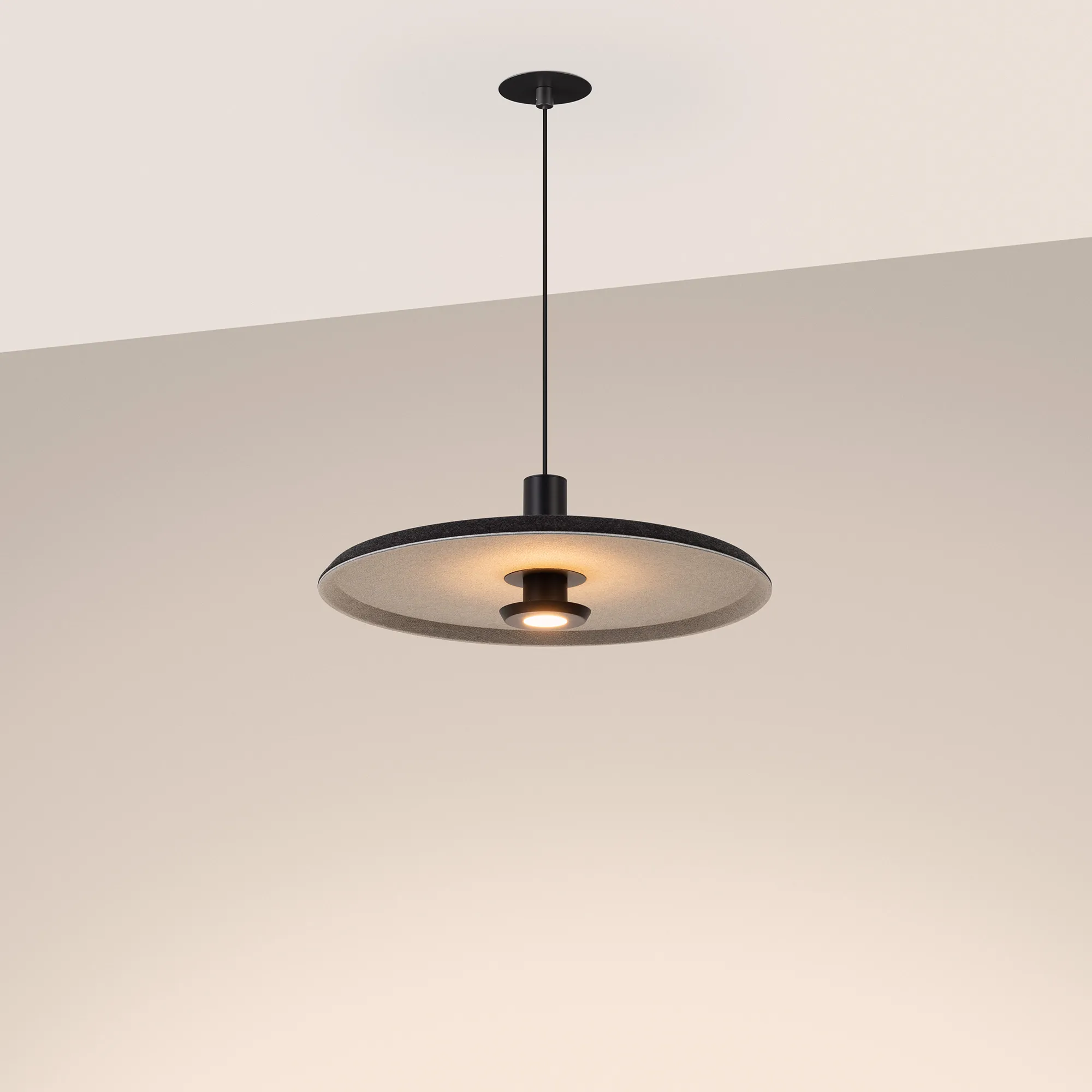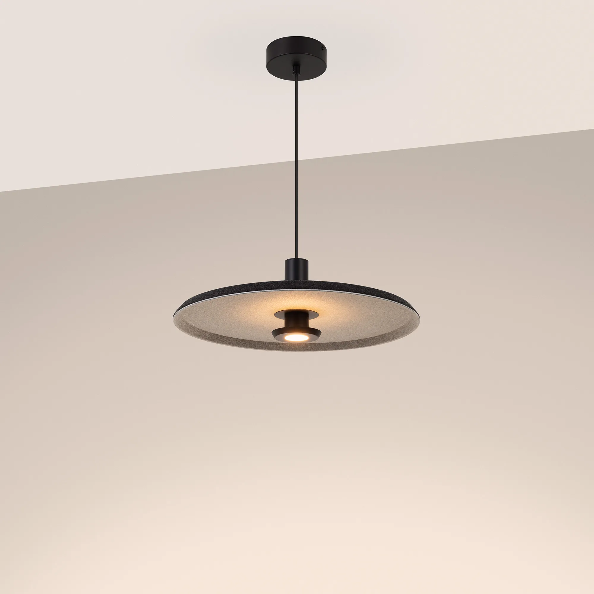 Подвесной светильник. Мощность 12 Вт, св. поток 768 лм, 64 лм/Вт, теплый 3000 K, CRI>94, угол 36°, напряжение питания 230 В. Темно-серый фигурный плафон из переработанного фетра со светло-серой внутренней поверхностью, линза-рассеиватель из PMMA, степень защиты IP20. Размер: диаметр 450 мм, высота 145 мм. Монтаж подвесной, длина подвеса 2000 мм, регулируемая. В комплекте 2 вида чаш. Габариты чаши (встраиваемая) Ø80 х 23 мм, врезное отверстие Ø60 мм. Габариты чаши (накладная) Ø120 x 35 мм. Драйвер 59В, 300 мА, пульсация <1%. Управление по TRIAC.