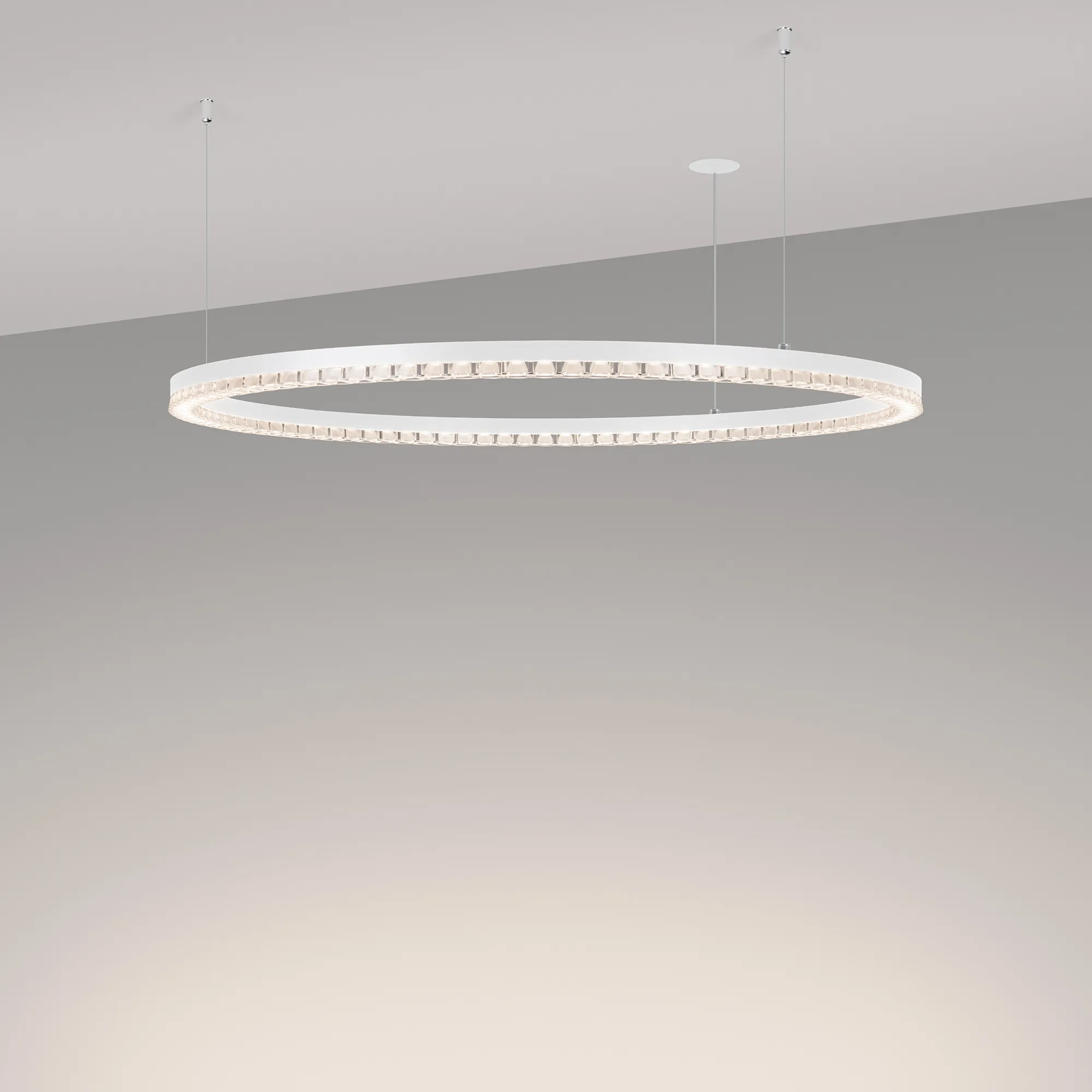 Под заказ. Подвесной светильник. Мощность 40 Вт, св. поток 3460 лм, 80-95 лм/Вт, дневной белый 4000 K, CRI>90, угол 45°, напряжение питания 230 В. Белый круглый корпус из алюминия, экран PMMA, степень защиты IP20. Размер: диаметр 850 мм, высота 34мм, ширина профиля 30 мм, размер чаши: диаметр 65 мм, высота 26 мм. Монтаж подвесной, длина подвеса 1200 мм, тип чаши встраиваемый, диаметр установочного отверстия чаши 60 мм. Драйвер 27-38 В, 1050 мА. Пульсация <0.3 %.