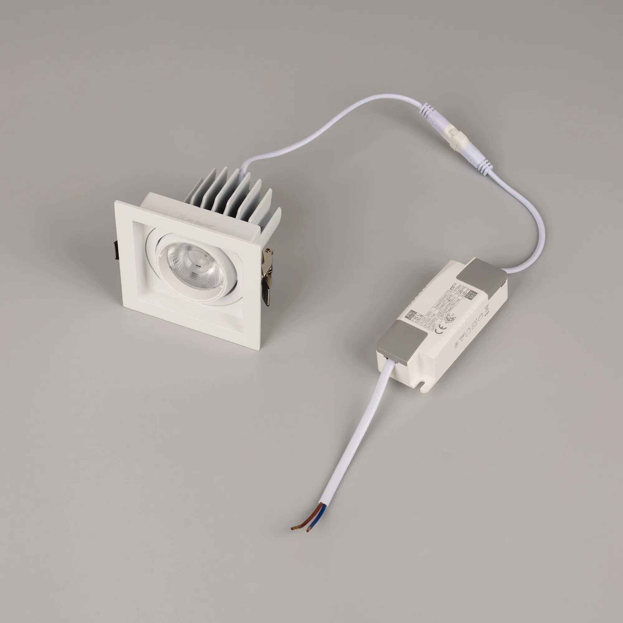 Встраиваемый карданный светильник. Мощность 12 Вт, св. поток 1394 лм, 116 лм/Вт, дневной 4000 K, CRI>92, угол 40°, напряжение питания 230 В. Белый корпус из алюминия, белая вставка, степень защиты IP20. Размер: длина 90 мм, ширина 90 мм, высота 80 мм. Монтаж встраиваемый, установочное отверстие: длина 75 мм, ширина 75 мм. Драйвер 27-40 В, 300 мА, пульсация <2%.