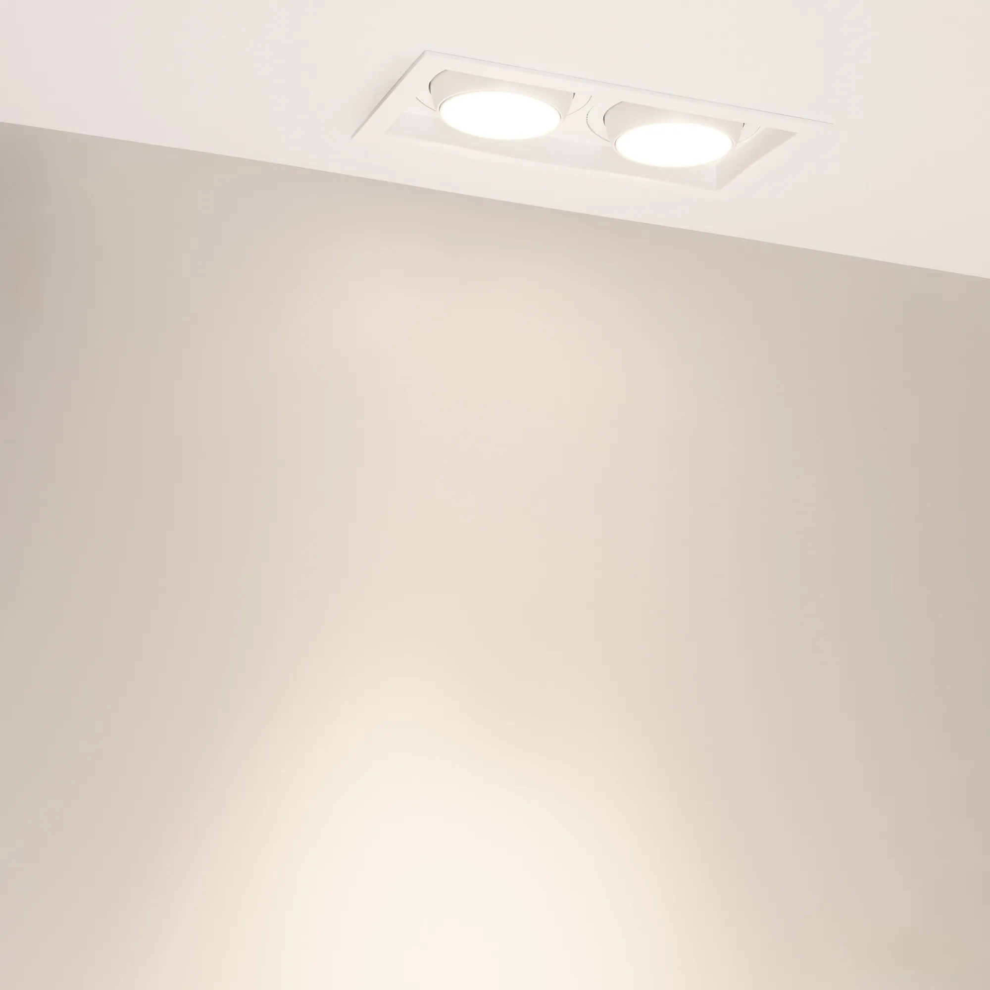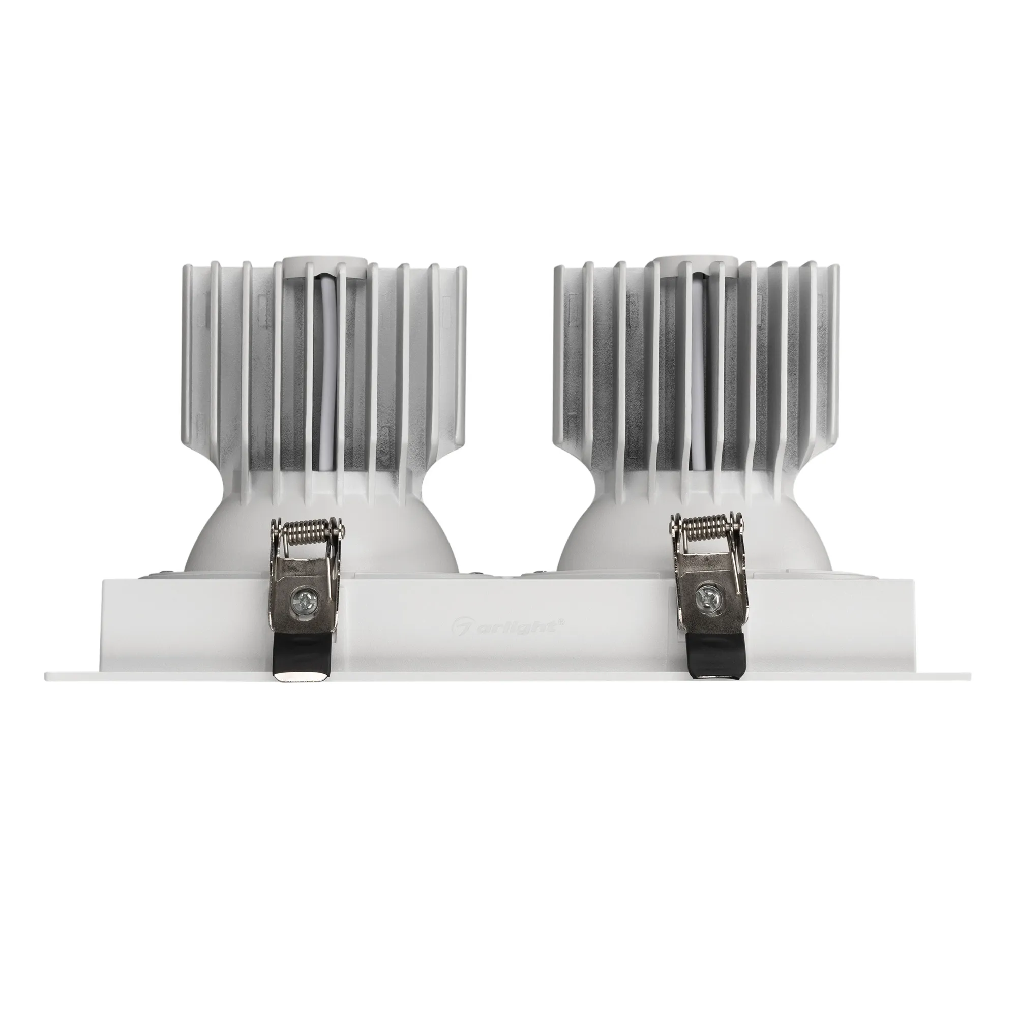 Встраиваемый карданный светильник. Мощность 2х30 Вт, св. поток 6520 лм, 108 лм/Вт, дневной 4000 K, CRI>92, угол 30°, напряжение питания 230 В. Белый корпус из алюминия, степень защиты IP20. Размер: длина 250 мм, ширина 140 мм, высота 125 мм. Монтаж встраиваемый, установочное отверстие: длина 230 мм, ширина 120 мм. Драйвер 24-42 В, 750 мА, пульсация <2%.