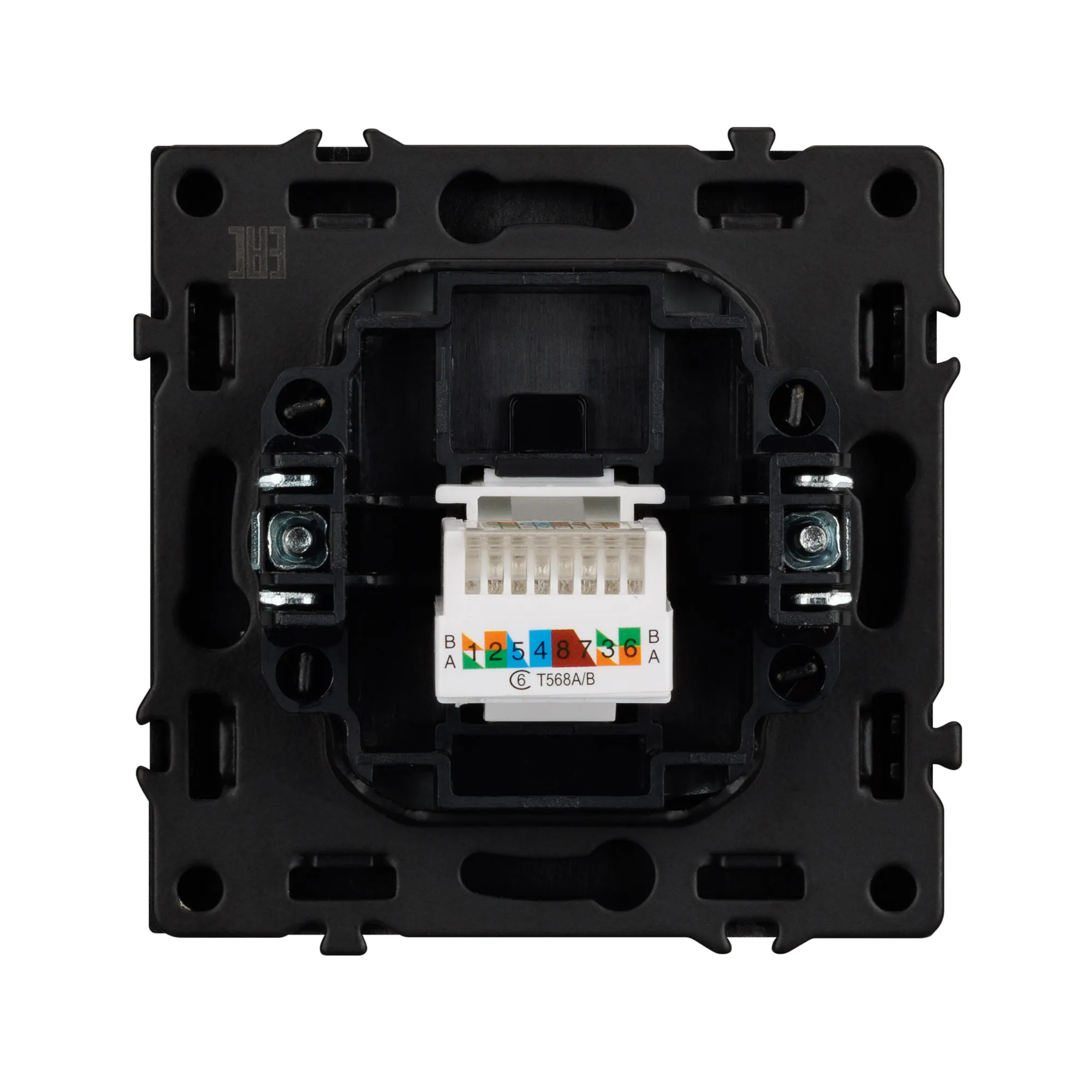 Механизм компьютерной розетки на 1 пост 6-й категории. Цвет - серый базальт, с Soft-Touch покрытием. Без фронтальной рамки. Уровень пылевлагозащиты IP20. Тип подключаемого разъема - RJ45. Розетка устанавливается в стандартный подрозетник круглого сечения диаметром 60мм.