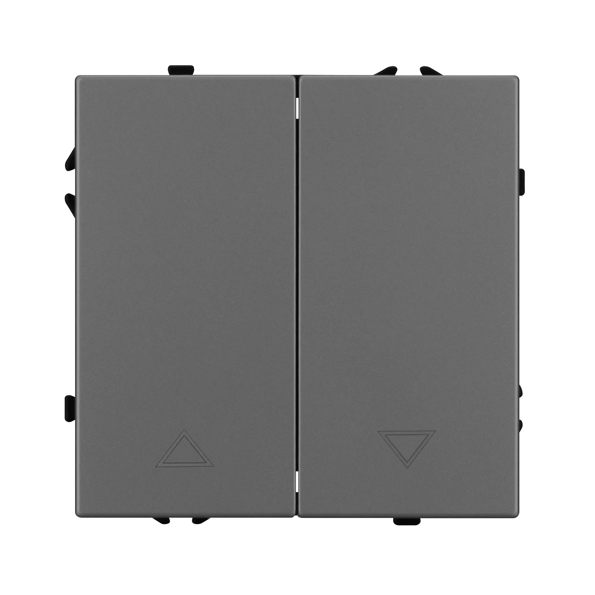 Механизм выключателя управления шторами на 1 пост 2 перекидные клавиши. Цвет - серый, с Soft-Touch покрытием. Без фронтальной рамки. Уровень пылевлагозащиты IP20. Выключатель устанавливается в стандартный круглый подрозетник круглого сечения диаметром 60мм.