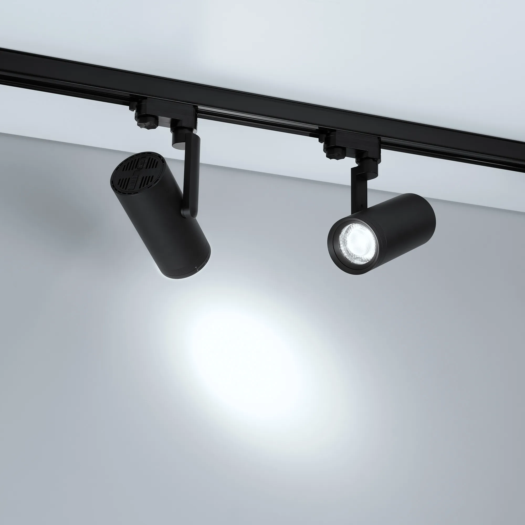 Светильник для треков/шин 4 провода, 18Вт/25Вт. Цвет свечения меняется в диапазоне 2700K/3000K/3500K/4000K/5700K (при помощи переключателя на корпусе), световой поток 1140-2075лм, регулируемый угол 20°-50°, CRI>90. Корпус круглый, металл, цвет черный, IP20. Угол наклона корпуса 90°, угол поворота корпуса 330°. Габариты LxWxH: 90х75x255мм. Размер модуля DxL: 75x165мм. Входное напряжение AC220-240V, мощность 25Вт.