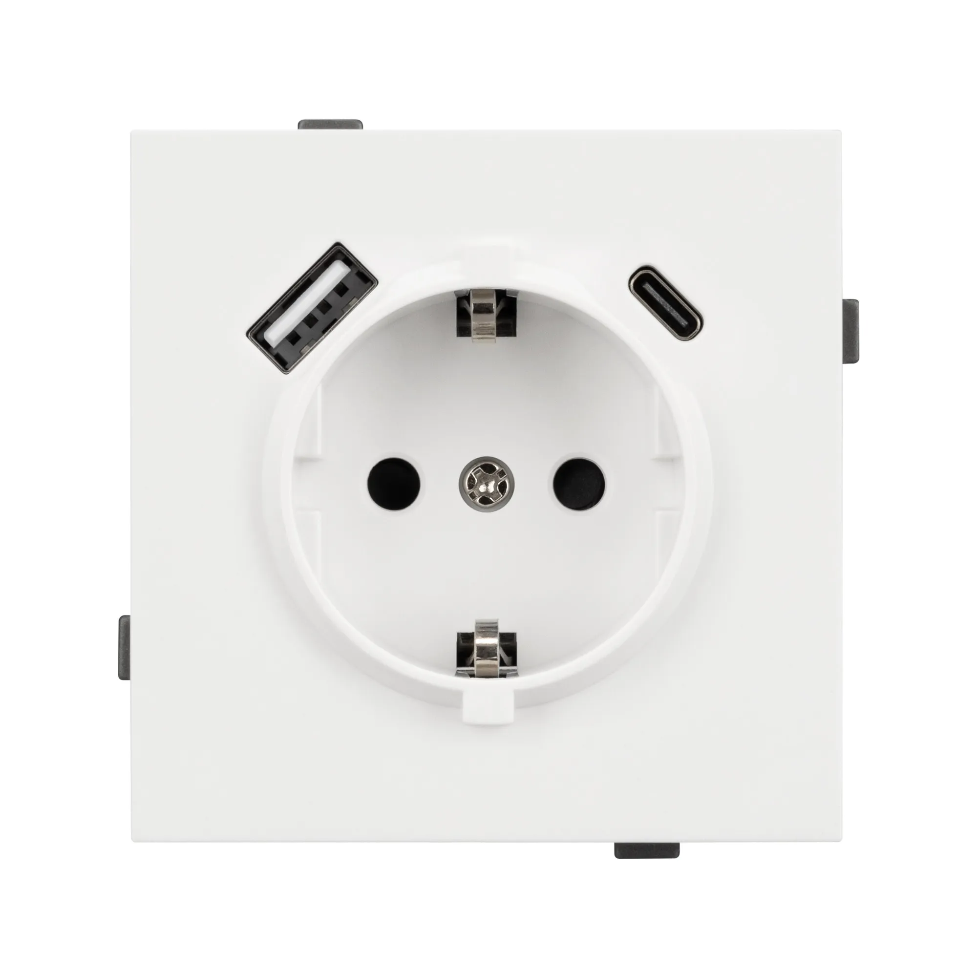Механизм розетки с заземлением 1 пост 2 USB Type A+C порта. Цвет - матовый белый, с Soft-Touch покрытием. Без фронтальной рамки. Уровень пылевлагозащиты IP20. Розетка устанавливается в стандартный подрозетник круглого сечения диаметром 60мм.