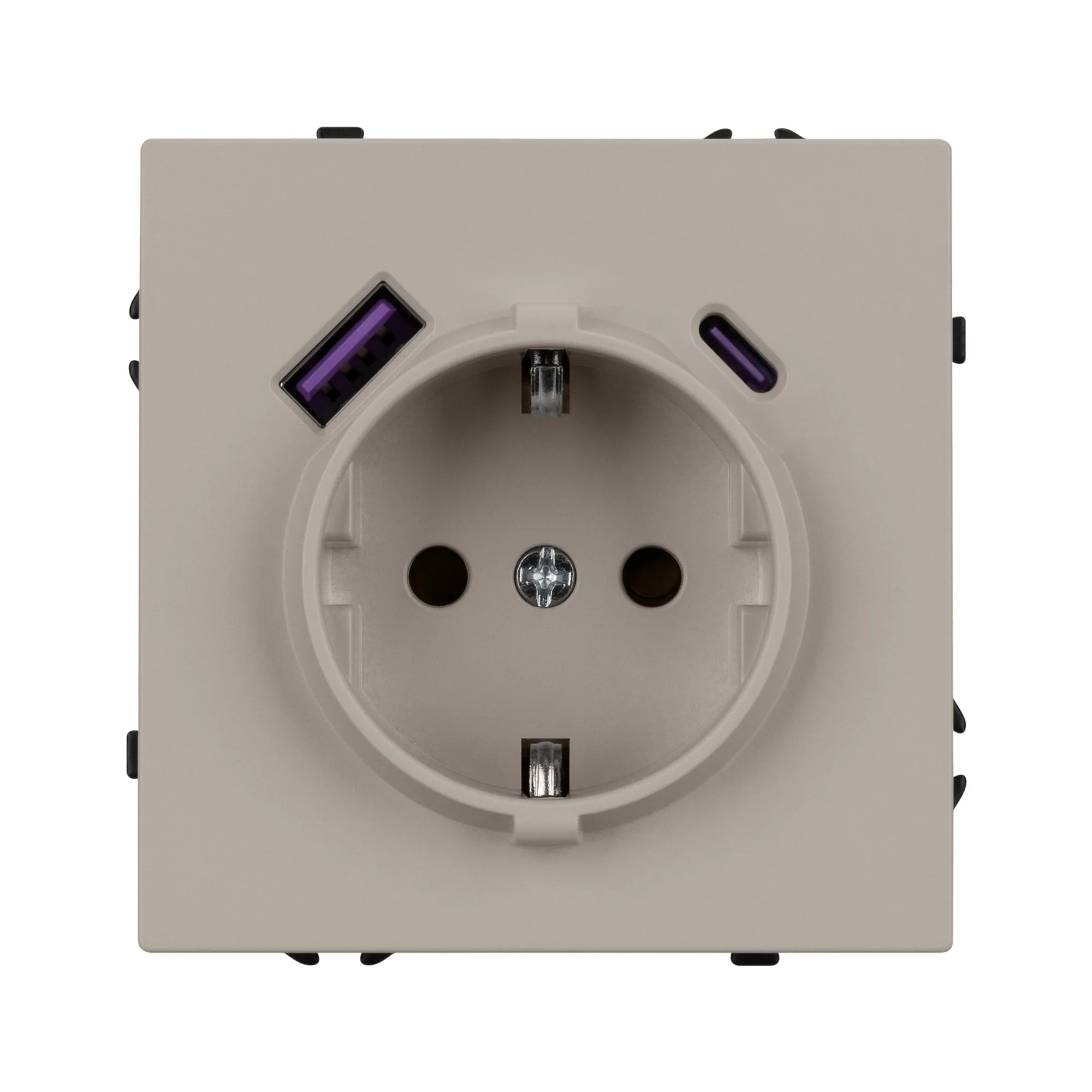 Механизм розетки с заземлением 1 пост и 2 USB Type A+C порта. Цвет - кашемир, с Soft-Touch поверхностью. Без фронтальной рамки. Уровень пылевлагозащиты IP20. Розетка устанавливается в стандартный подрозетник круглого сечения диаметром 60мм.