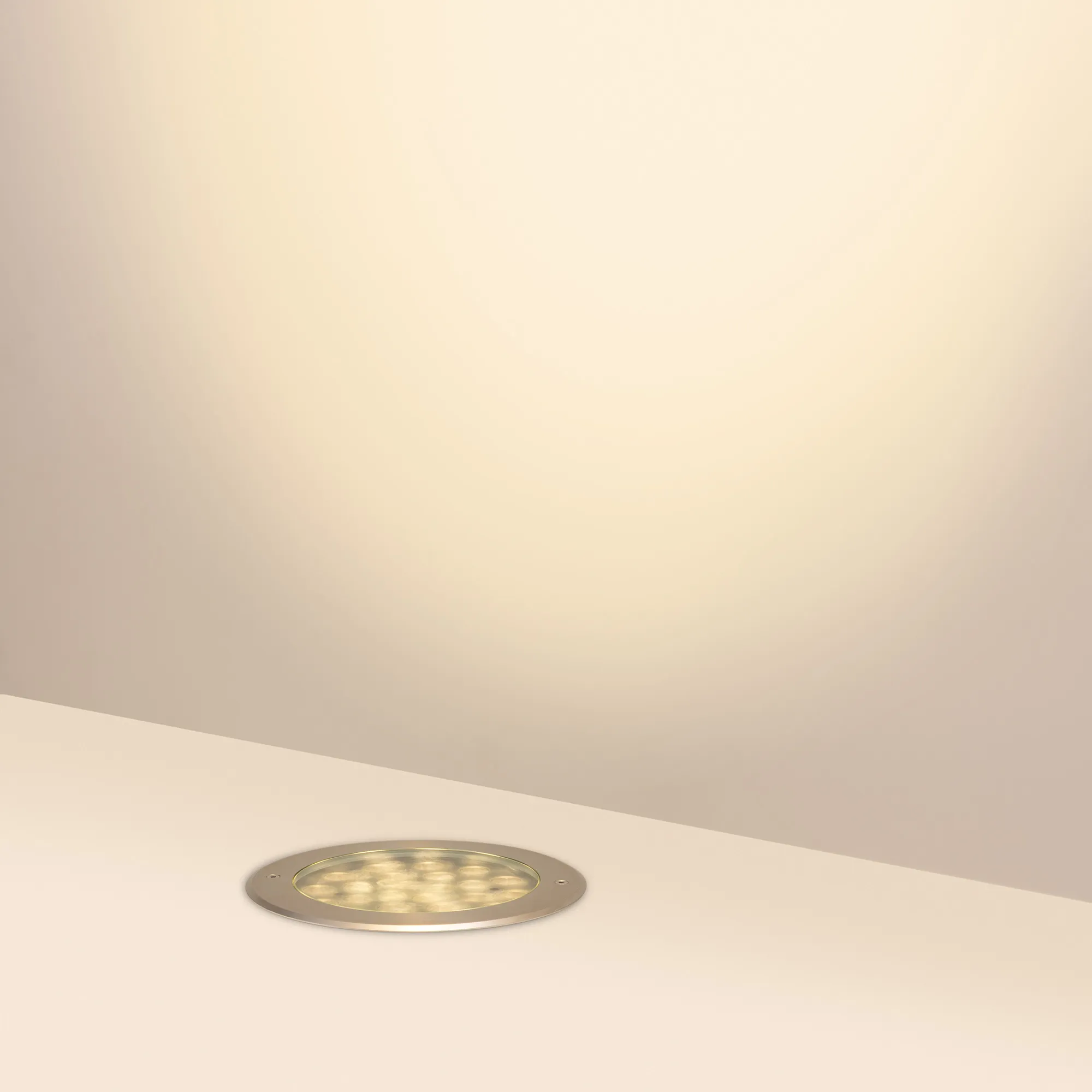 Встраиваемый светодиодный светильник для грунта и пола. Мощность 48Вт, световой поток 3250 лм, цвет теплый 3000К. CRI(Ra)>80, угол 45°. Круглый влагозащищенный корпус IP67, нержавеющая сталь. Экран закалённое стекло. Питание 230В, 48Вт. Размер DxH Ø260x150мм. Установка в отверстие DxH Ø239x144мм.