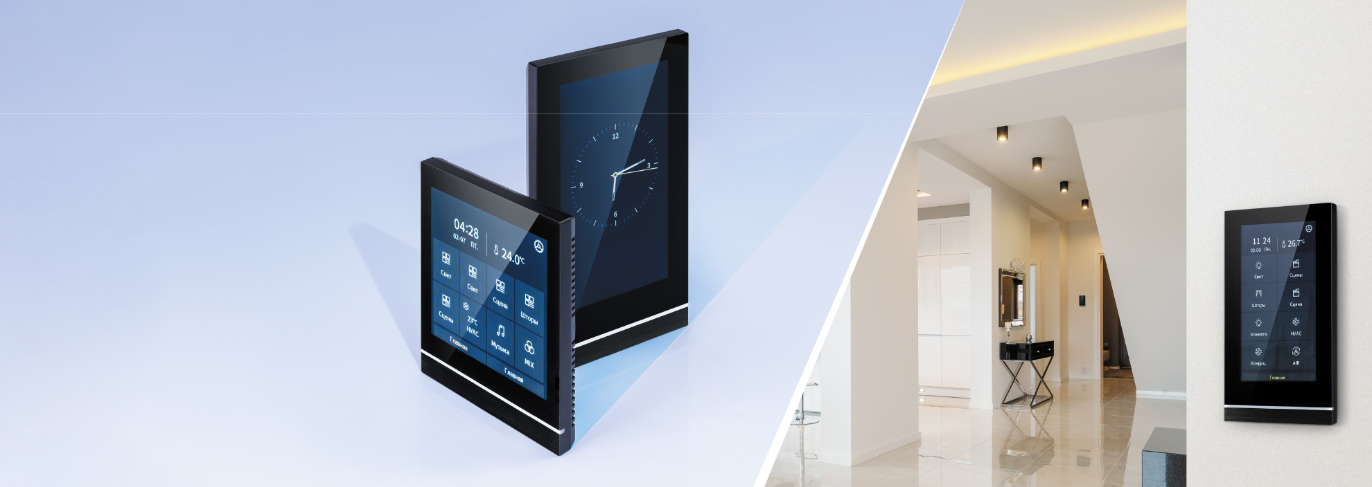 Панели отличаются стильным дизайном: корпус из благородного черного шлифованного металла и закаленного стекла. Благодаря тонкому экрану и скошенным задним граням панель, размещенная на стене, выглядит парящей и невесомой. Форма и исполнение панели позволяют вписать ее в любой интерьер.